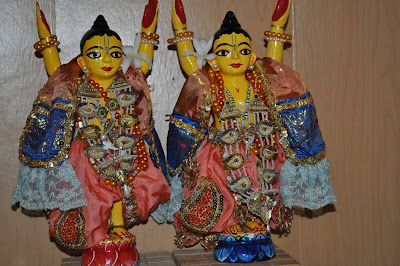 As I open the guest altar two smily faces affront me. The gleaming spring sun casts its rays through a parting in the window, this makes the already shiny faces glisten like the morning dew. Whenever i see the little Nimai-Nitai deities as i call Them, visions of Their past flash through my mind. "They are from Ekacakra and the shopkeeper who made Them said They were very special," the voice of my friend echoes in my mind. I envision Them having been served by associates of Caitanya Mahaprabhu in the times of great Sankirtan Revolution that took place long ago in Nadia..Visions of Gauridas Pandit's Gaura Nitai deities jumping off the altar and running to join the Kirtan. Visions of Pisima Goswamini's Gaura Nitai trading Their jewelry for rabri. Visions of Nimai crying for the moon and visions of Vasudev ghosh glorifying Nimai playing hide and seek with his brother in his enchanting childhood form."But aren't all deities special?" counters my mind. It then goes on to answer its own question by putting forth arguments and counter arguments about how the deities are special aand how the deities from Ekacakra are still special. All the while my hands are moving briskly collecting the Nirmalya flowers, filling water in Their pots and trying to concentrate on the seva at hand. But my mind and and gaze returns to the sweet faces of the two boys. For a moment as I admire Their chubby legs, flood pants, curly locks of hair and wondrous eyes, time stands still...I'm brought to the present by the sound of the cooker and the chirping of the noisy birds, which seem to be instructing me to chant my Gayatri mantra and rush back to the kitchen to tend to the bhoga. They came to stay for week, but stayed for over a month and have my heart in Their grasp. My heart overflows with gratitude for my spiritual master, who named our own Gaura Nitai deities as Nimai- Nitai and for Srila Prabhupada who gave us this scientific method of devotional service to the Lord, paving the way to reclaiming our lost idetitities and establishing our true connections, being in the world and not being of it. Jai Nimai -Nitai, Jai Srila Prabhupada!